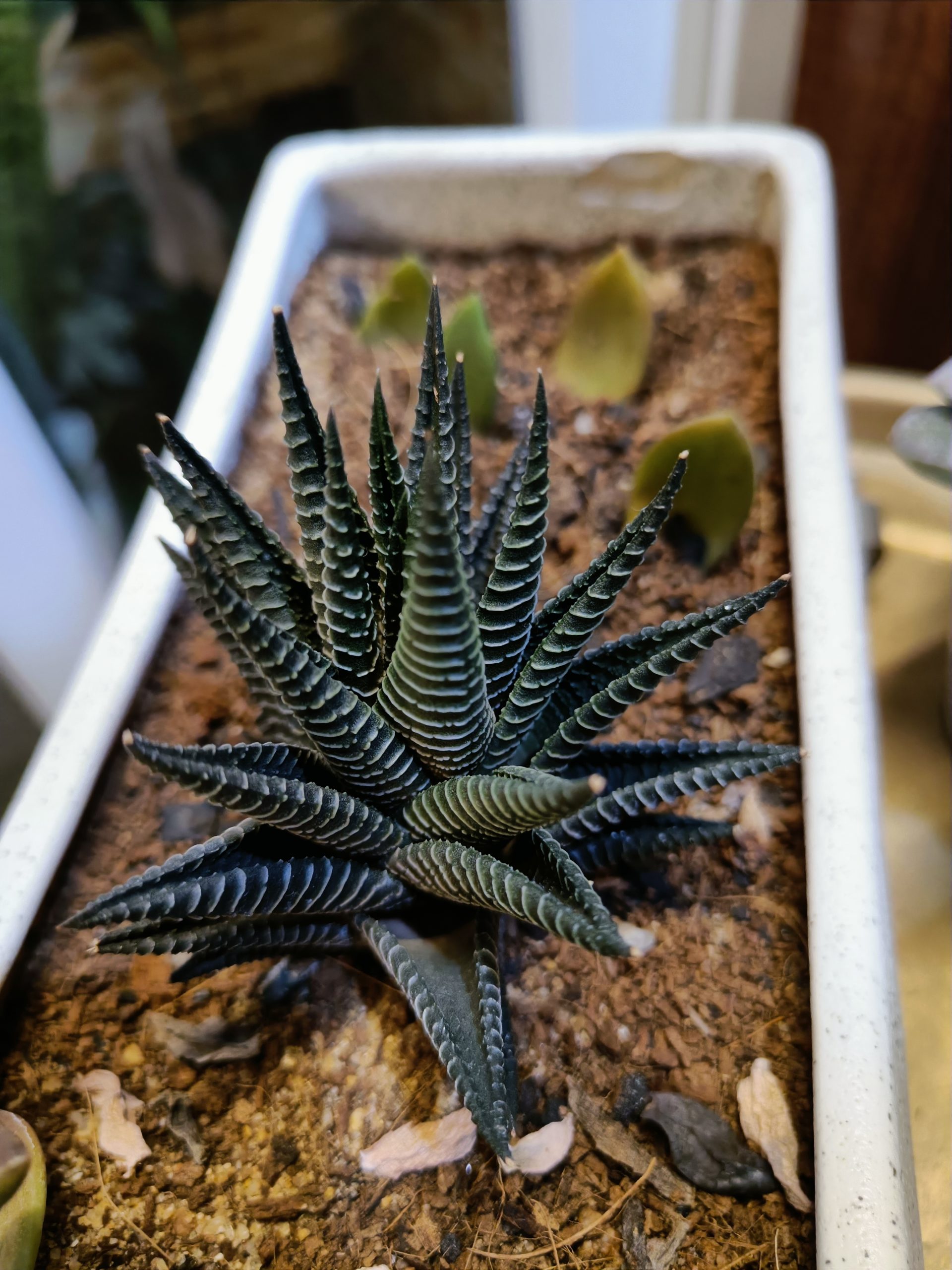 The Variegated Haworthia limifolia, also known as Fairy Washboard, is a striking succulent with ridged, triangular leaves featuring green and creamy-yellow variegation. It is a